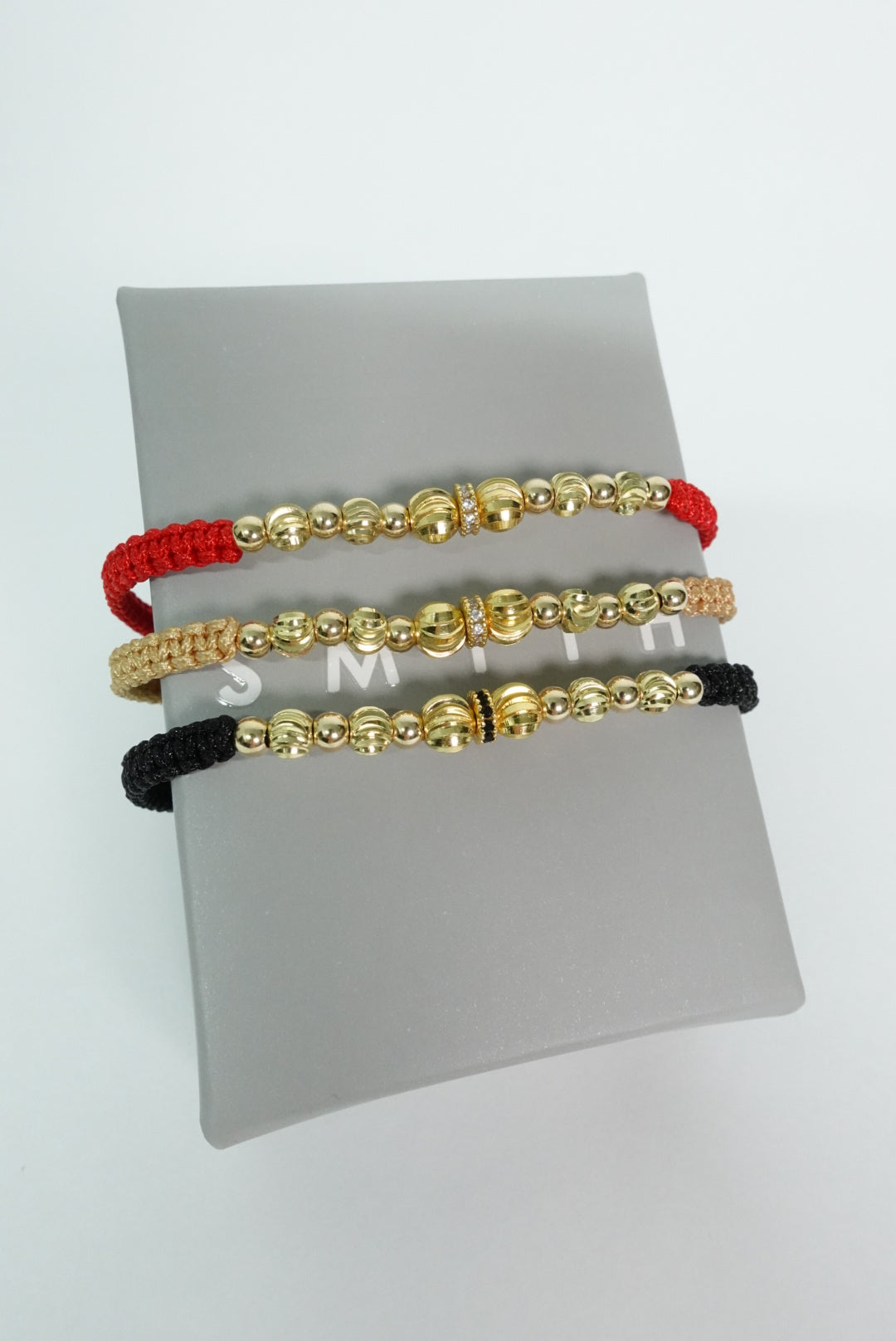 La pulsera de color negro trae un rondel en la mitad del mismo color del hilo, las pulseras roja y dorada el rondel es color cristal.