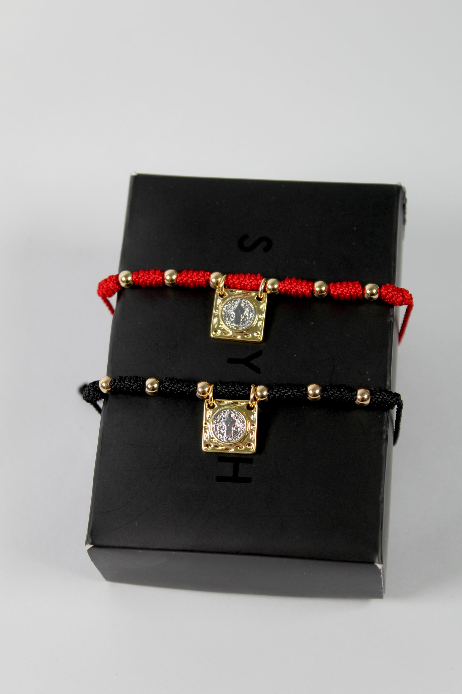 Traemos para ti la pulsera 7 nudos de protección, elaborada en hilo con balines 4mm en oro laminado 18K, acompañada de un dije de San Benito tipo escapulario; esta pulsera es considerada un amuleto que protege contra el mal de ojo, la envidia y las energías negativas, también se dice que atrae la buena suerte y la prosperidad.