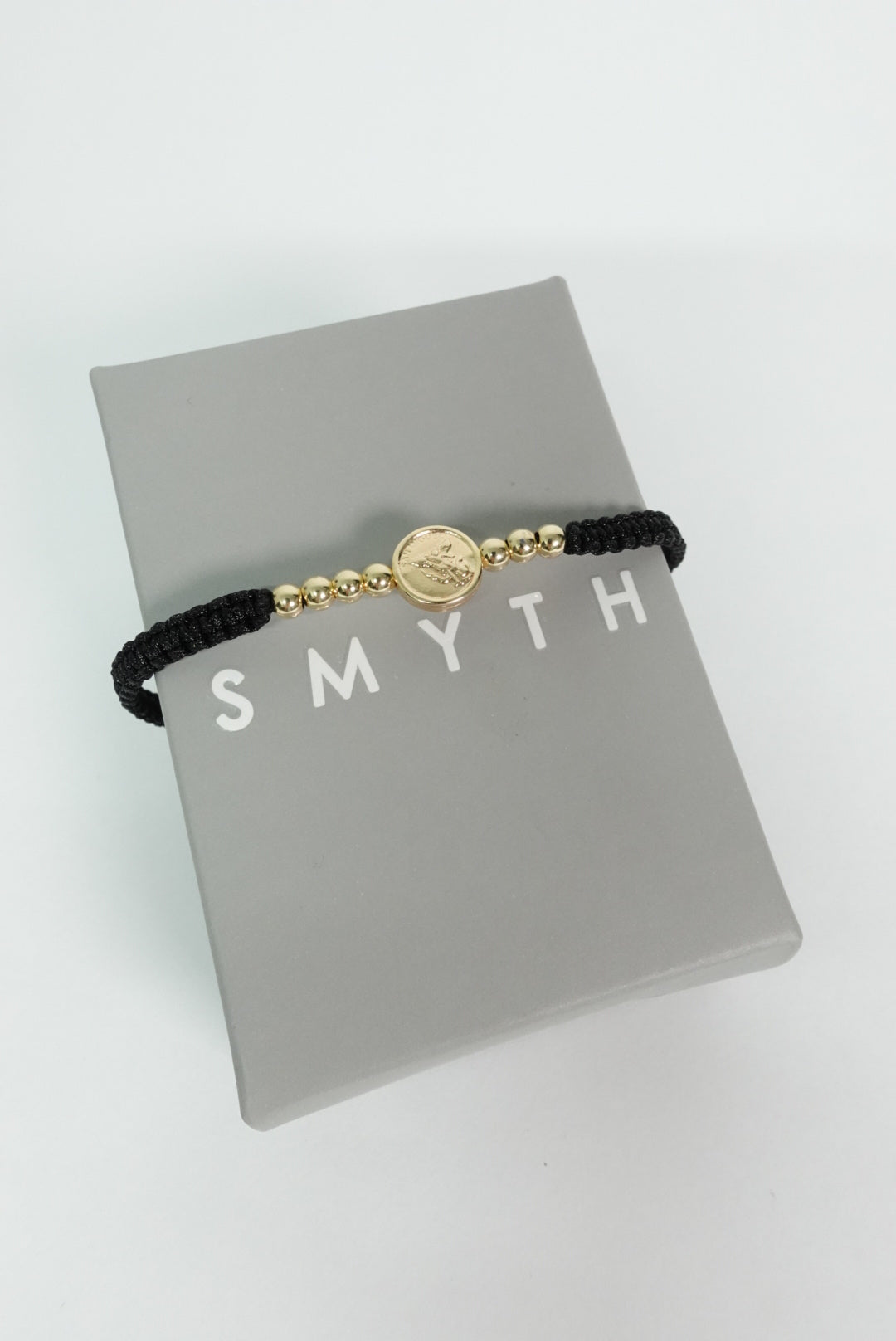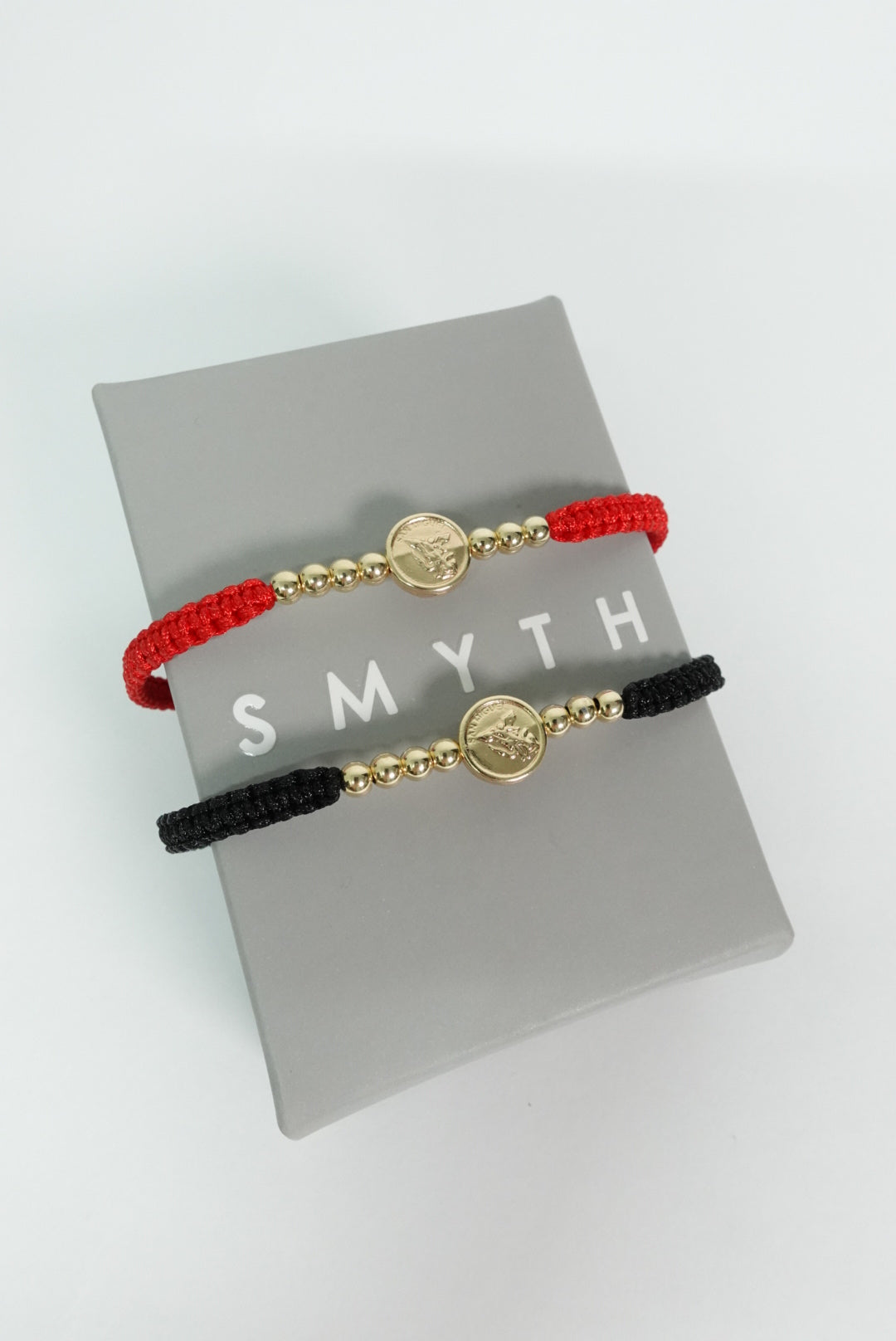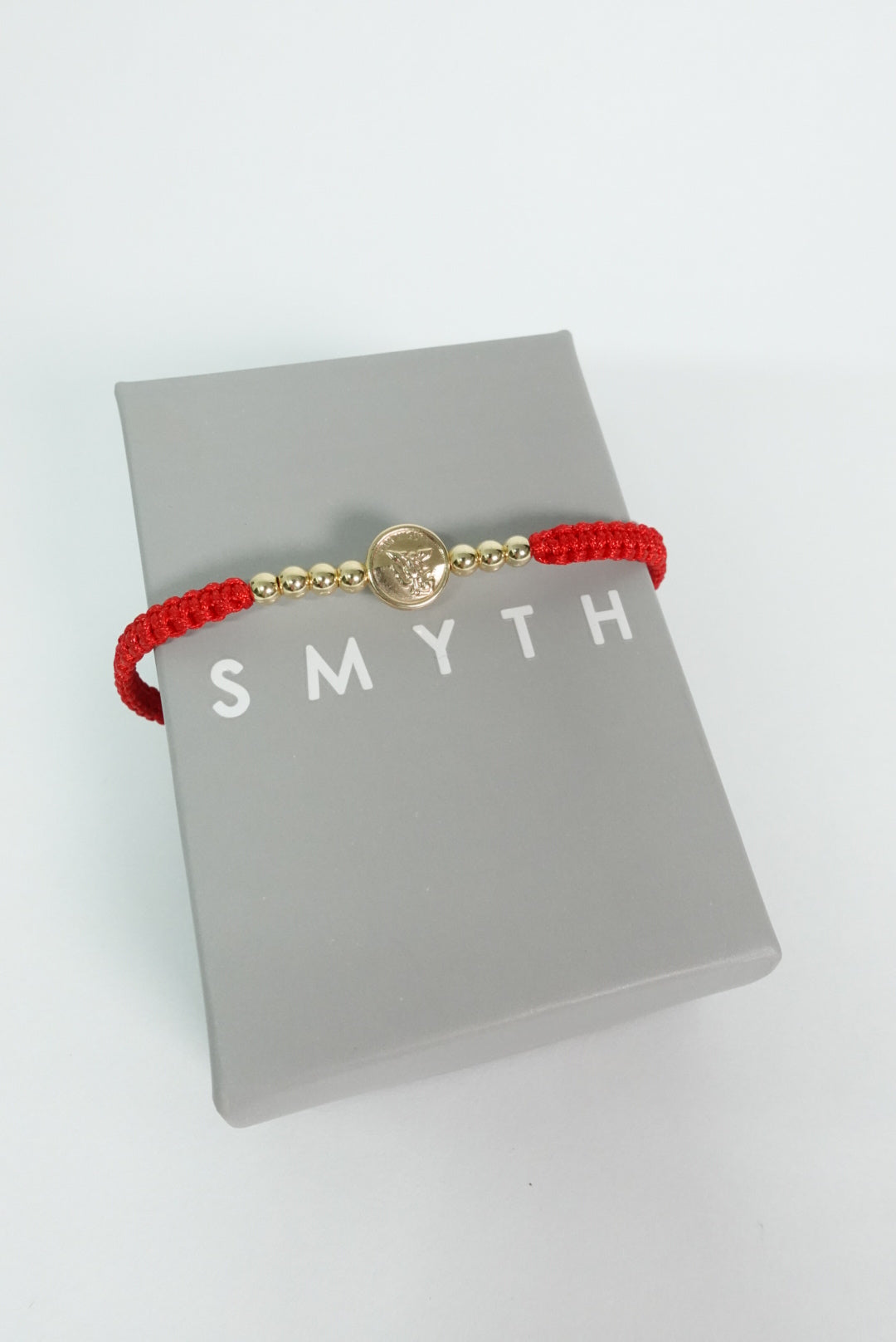 Pulsera elaborada en hilo con dije de San Miguel Arcángel y 7 balines 4mm en oro laminado.