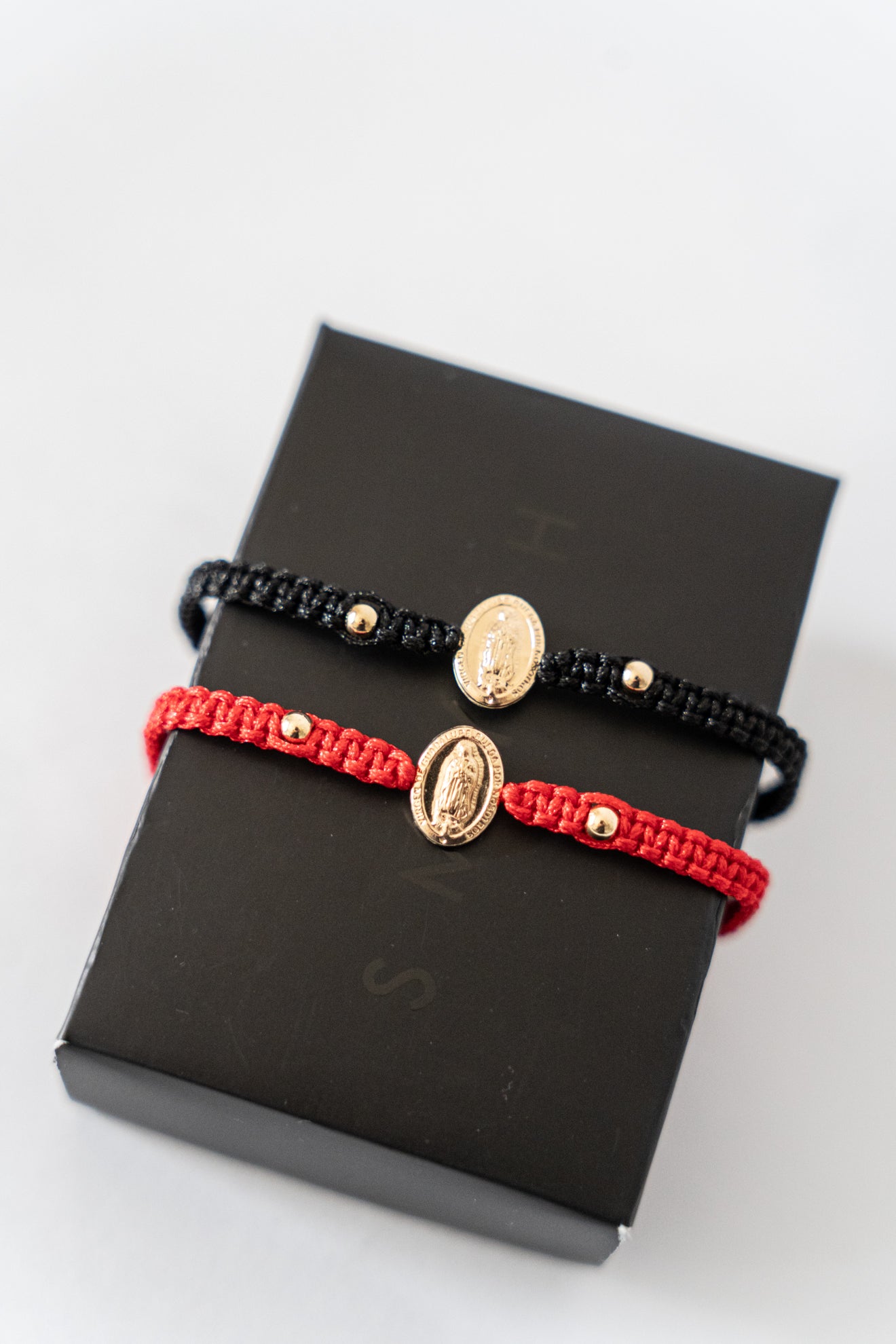 Pulsera elaborada en hilo, balines en oro laminado 4mm y un dije de la Virgen de Guadalupe.